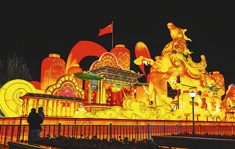 杨青水驿是明清时期京杭大运河沿线的重要水驿,“杨青水驿”灯组以杨柳青运河漕运文化为核心,复刻古驿水运转运的鲜活场景,牌楼镌刻“杨青水驿”四字,漕运劳工、货箱车驾等造型栩栩如生,让人仿佛穿越时空,回溯杨柳青因水而兴、因驿而盛的岁月,感受当地依托运河发展的深厚历史脉络。