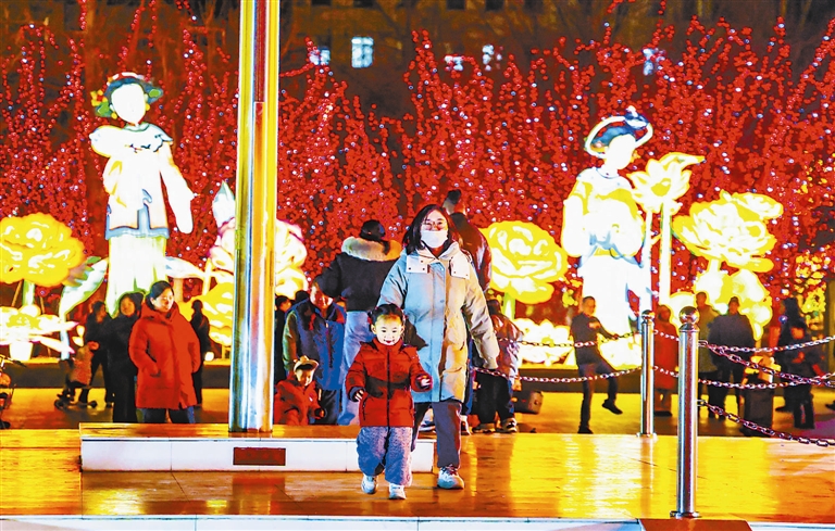 此外,还有“赶大营”“漕运盛景”“仕女游春图”“锦屏古韵”“津韵剪影·生肖漫游”“财神赐福”“鱼龙舞”等其他主题灯组,一步一景,给予市民游客不同的视觉体验。同时,古镇还设置了多处独具特色的打卡互动区与民俗体验点,为不同年龄、不同需求的游客打造可玩可看可参与的沉浸式体验场景。