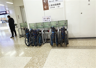 采访中遇到一位急诊患者正坐在轮椅上等待检查,陪同家属表示:“医院的共享轮椅很方便,但跟其他医院不一样,没有免费使用时段,万一租借后发现轮椅不好用,想换一辆,哪怕就用了几分钟,也得花1小时的钱。”