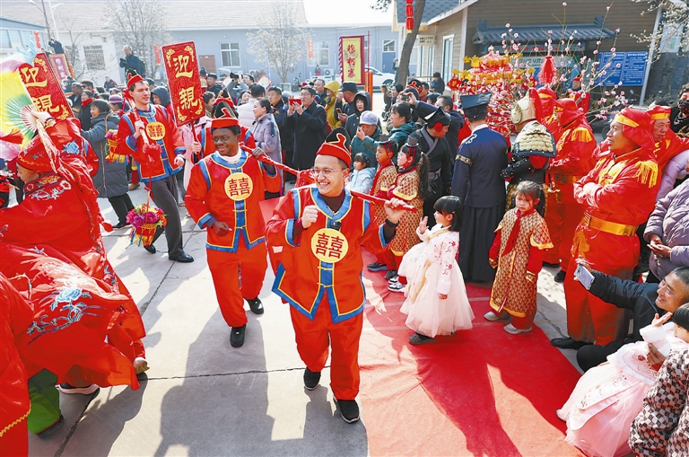 也门留学生那迪扮演抬着嫁妆的轿夫,他是第一次参加走进山村过年的活动,“这就是年味儿的感觉”。