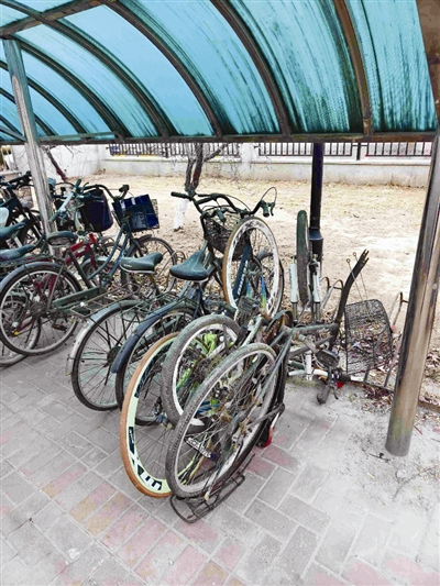 记者在小区内转了一圈看到,在2号楼门前、小区的中央花园、非机动车棚以及地下车库出入口,停放了很多废旧的非机动车。其中2号楼门口的废旧非机动车比较集中,粗略数有十几辆。一些非机动车车座缺失,还有的车身锈蚀,看上去已经很久没有人使用了。