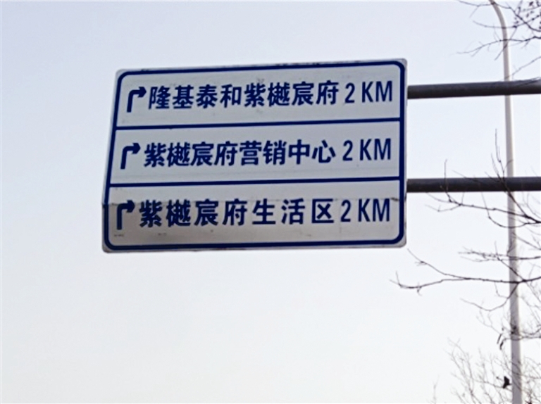接到市民反映后,记者驱车来到现场采访,在外环东路自北向南去往金钟河桥方向的新开河装饰城一侧的绿地上,一个四五米高的灰色杆体上写有“隆基泰和紫樾宸府 2KM”字样的牌子设置在此,明显系广告牌。记者向附近几位停车候客的出租车驾驶员询问,驾驶员表示,这明显是具有广告性质的指路牌,很容易误导过往机动车驾驶员。