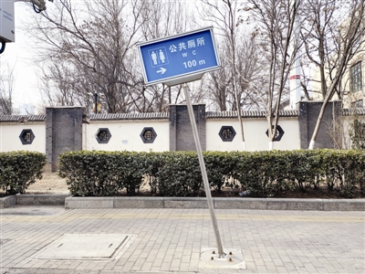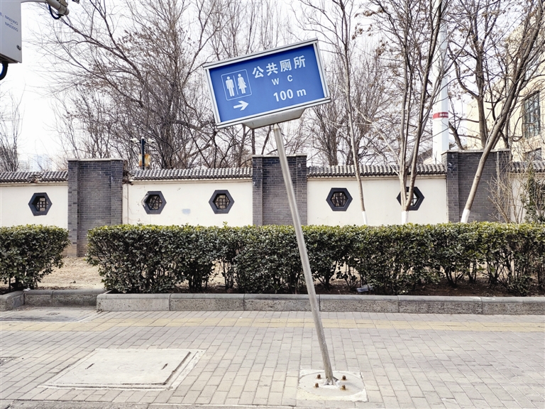 市民高先生反映,南开区城厢东路公交站北侧人行道上,一块公共厕所指示牌出现倾斜,望相关部门尽快修复。 文/摄 记者 刘波
