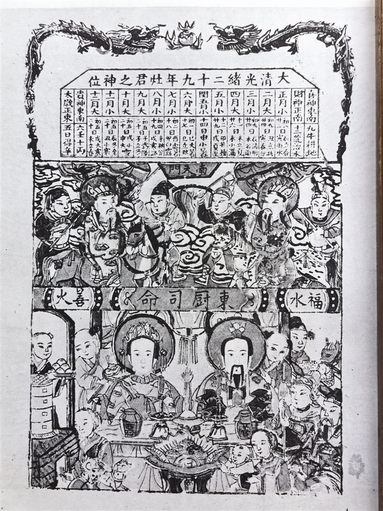 “几牛耕田”“几龙治水”,要看正月日支第一次出现丑和辰在哪天。清光绪二十九年(1903)杨柳青年画《上天双灶》,画面腰部字匾(民间又称“字头”)“东厨司命”居中,“福水”“善火”分居两侧。三匾连接形成分隔,其上天宫南天门,灶王拜见玉皇,拱手答问;其下凡间,灶君夫妇端坐桌案前,有烧火作炊的,有抚婴抱孩的,有端盘上供的,有槽头喂马的,还画了鸡和狗,生活气息浓浓。上端历表印:九牛耕地、十二龙治水。该年正月丁巳朔,初九日乙丑,十二日戊辰。