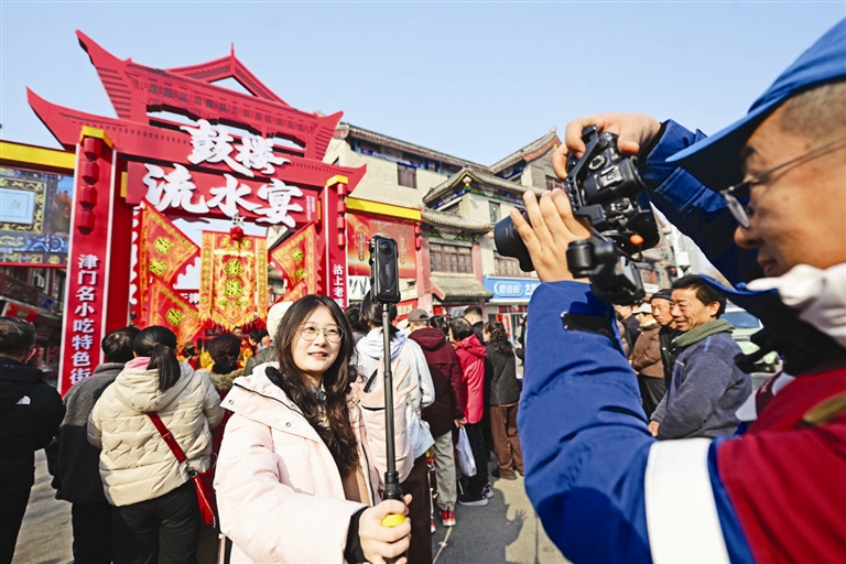 作为本次新春市集的核心餐饮板块,流水宴精心筹备、匠心汇聚,集结了天津本地三十余种特色美食、名优小吃与非遗风味。从酥脆鲜香的传统炸物、软糯香甜的津味糕点,到独具特色的非遗小吃、地道家常风味,各类美食琳琅满目、香气四溢。不少本地居民和外地游客纷纷驻足品尝,吃得津津有味、赞不绝口。大家一边享用美食,一边拍照打卡,欢声笑语不断。