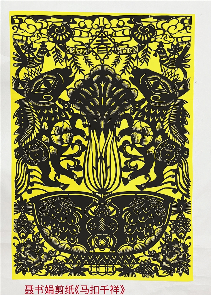 这幅作品的作者、天津滨海新区大港剪纸传承人聂书娟介绍,这幅剪纸以黑色宣纸剪制,衬以黄色与泥粉色底纸,整体构图采用对称形式。作品下方为民间传统图案扣碗,碗内剪有青蛙与葡萄,寓意是多子吉祥;扣碗上方中间是白菜,取“百财”谐音,承载百姓美好心愿;白菜两侧为两匹站立的骏马,马身搭配寿桃、牡丹纹样,象征积极向上、生活充满精气神;马的上方是如意纹样,作品正中位置则饰有带春字的中国结。