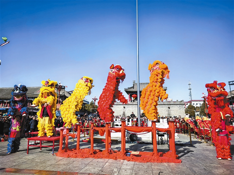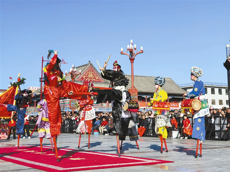 紧随其后的南狮梅花桩表演更是扣人心弦,8名演员操控的雄狮腾挪跳跃、登高采青,灵动的姿态引得观众连连叫好。3个中幡在演员手中上下翻飞、稳稳托举,尽显传统技艺的精妙;金龙、红龙双龙共舞,龙身穿梭盘旋,将新春的喜庆氛围拉满。翻跟头、劈叉、武跷接连上演的高跷表演,让观众大饱眼福;舞蹈快闪与《我和我的祖国》的温情演绎,更是让现场氛围在热闹之余多了一份家国温情。