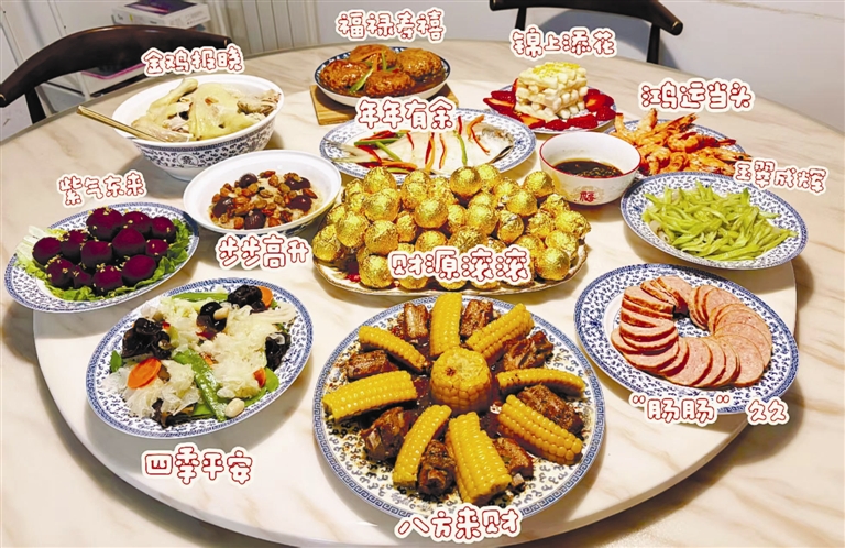 为了一桌子饭,从早到晚,脑子和手脚都“没识闲儿”,把一道道“走心”的菜做漂亮了,端上桌,听大伙儿异口同声:“嚯哦!太厉害了!”那就是成就感。为了能“露一手”,我总是得研究点儿新东西。今年,我用金橘做主料摆盘儿,取个财源滚滚的名儿;紫薯蒸了再配上蜂蜜、芝麻等做成甜品,取名“紫气东来”;玉米配排骨排成“八方来财”的造型……就是传统的肉啊、鱼啊之类都搞个新做法,家里老人、孩子都觉得又好吃,又好看,又吉利,人人高兴,这不才是过年嘛。作为年夜饭主厨,总有新鲜的拿出来,自己倍儿骄傲,全家又高兴,这多好。