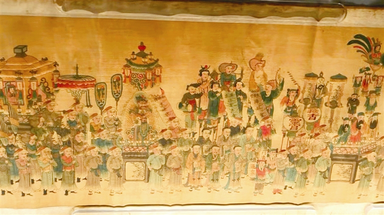 “它是从卷尾开始展开的,包括天后妈祖的五架宝辇,还有灵官辇、扫殿会、抬阁会、重阁会、西码头京秧歌会、中幡老会……”丁袁磊介绍,包括卷头在内,这幅图差不多还有四分之一未曾展开。