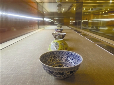 此次展览有两组“明星展品”值得观众特别关注。其中一组是一整套道光节令膳碗。节令膳碗特指皇帝在四时节令之日用膳时所使用的碗,仅乾隆、嘉庆、道光三朝有烧,且乾嘉制品数量极少。节令膳碗均为内青花外色地轧道开光洋彩品种,共有8种样式,分别装饰应季应景的花果动物、神话故事、象征景物等,对应不同的节令,依次为正月初一年节的三阳开泰、正月十五上元节的五谷丰登、五月初五端阳节的艾叶灵符、七月初七七夕节的鹊桥仙渡、八月十五中秋节的丹桂飘香、九月初九重阳节的重阳菊花以及皇帝生日万寿节的万寿无疆(乾隆帝八月十三、嘉庆帝十月初六、道光帝八月初十)、寻常时节的万花献瑞(如正月初五“破五”、正月初九玉皇诞、四月二十八药王诞、冬至、十二月初八“腊八”等)。8件成套展陈,装饰效果极佳,且与传统民俗文化高度契合。除节令膳碗外,同时还展出膳碗碗样和装饰风格相近的色地洋彩锦上添花膳碗,以及无论名称还是存贮方式都与节令膳碗关系密切的洋彩三阳开泰斗笠碗,从而构成一个完整的系列小专题。
