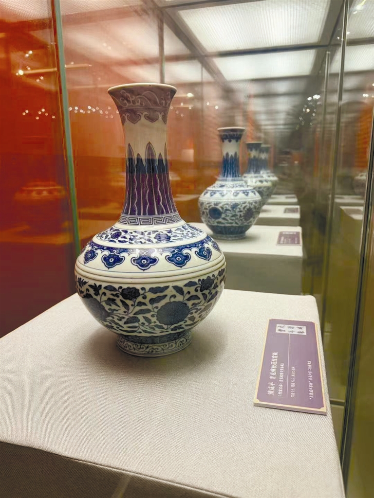 另一组极具看点的展品则是展厅最后8件从乾隆到宣统连续排列、中间没有缺项的青花缠枝莲纹赏瓶。青花赏瓶创烧于雍正八年(1730),在清宫档案中称作“玉堂春瓶”,原本是雍正帝钦定一批赏用瓷瓶之中的一种,由于造型端庄,寓意“清廉”,此后各朝均有烧造,甚至从民国开始,“赏瓶”取代“玉堂春瓶”成为这一经典品种的专称。根据器形和纹饰的些微差别,赏瓶又可分为两式。一式肩部鼓起凸棱,腹部绘单层缠枝莲纹,称为“宣窑青花起线玉堂春瓶”,另一式肩部不鼓起凸棱,腹部绘双层缠枝莲纹,称为“宣窑青花玉堂春瓶”。前者自雍正朝延烧至宣统朝,后者同样始烧于雍正朝,但从道光二十五年(1845)起停烧。传世至今的雍正青花赏瓶寥寥无几,此次能完整展示从乾隆朝到宣统朝的青花赏瓶已属难得,且起线和不起线的乾隆赏瓶各展出了一件。通过对比,观众能够清楚感知百余年间赏瓶青花画工、青料发色乃至瓷坯成型所呈现出的多处变化。