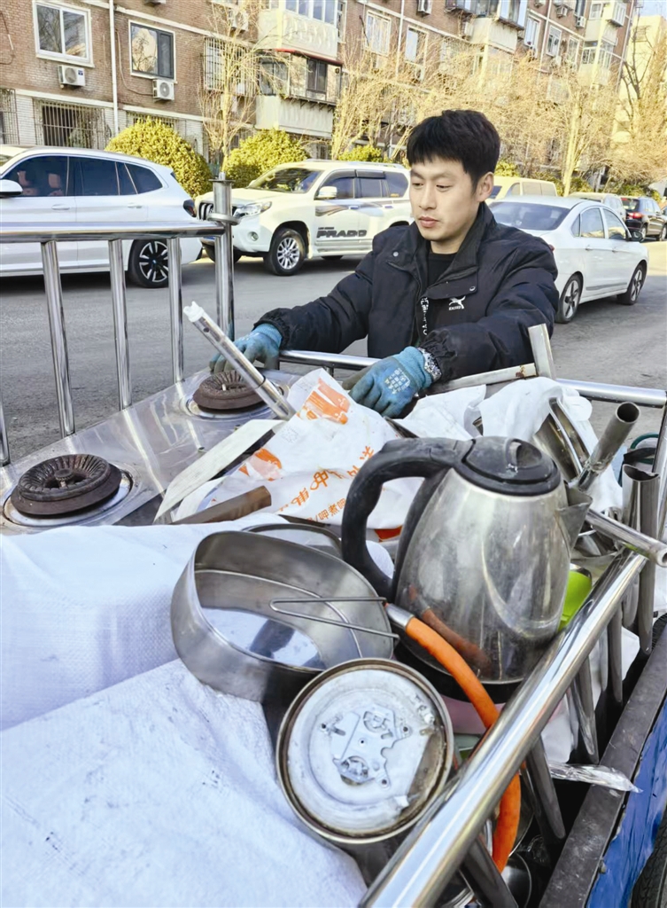上午九点多,气温稍有回升。刘方迎来了第一位大客户——一位50岁左右的大哥,他的一辆电动三轮车满满当当地堆着钢筋、不锈钢管、破旧的锅碗瓢盆,还有破旧的烟机和灶具,沉甸甸的货物把三轮车压得微微发颤。