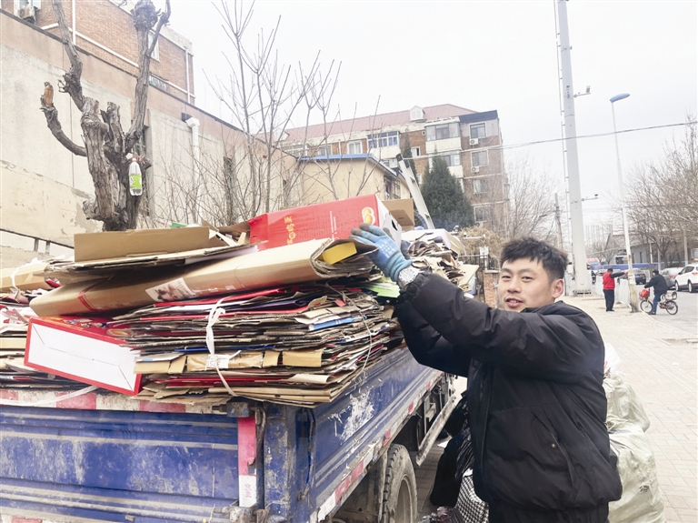 正月十二早晨七点,天空阴沉,街头还很冷清。在南开区华苑地区,一条与快速路隔着几栋居民楼的小路上,27岁的刘方,一个从安徽来津打拼的年轻“破烂王”,正在往货车的车厢里码放成捆的纸箱子。手机天气显示气温只有1摄氏度,一阵阵寒风吹来,刮在脸上冷飕飕的。刘方裹着一件厚重的深色棉衣,里面还叠穿一件加绒卫衣仍挡不住寒意。这个废品收购点,有一间不大的房间,地磅、几个鼓得快炸开的蛇皮袋等物品摆在了大门外。附近居民陆续来这里,送上打包好的废品。过磅、捆绑,刘方和亲戚们忙得抬不起头。