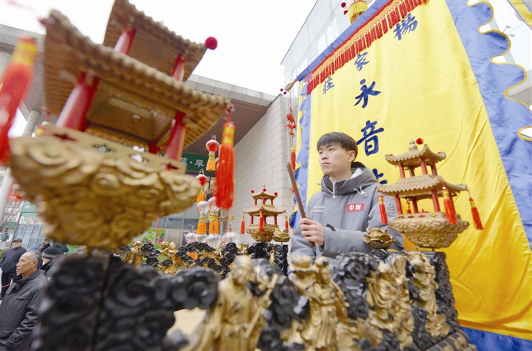 正月十三,河西区南北大街与古海道交口广场上,“咚!咚!咚!”三声厚重的鼓点划破长空,杨家庄永音法鼓老会丙午马年开箱演出热闹启幕。