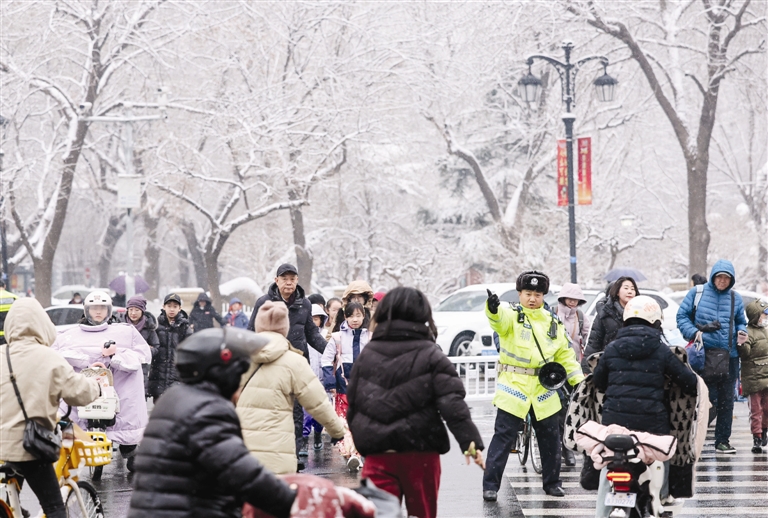 一场降雪与“开学迎新”不期相遇,通勤车流和送学车流叠加,全市道路交通流量显著攀升,交通早高峰有所提前。全市公安交管部门结合降雪情况,增派警力,加大对校园周边道路的巡查管控,特别是强化南京路、曲阜道、黑牛城道快速路等中心城区通行主干道疏导保障,确保道路通行安全、畅通。
