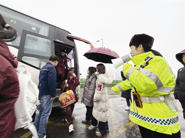 昨天6时20分,一辆带着“美达菲护学48线”标志的大巴车,停靠在了宾悦桥东公交车站,此时天空还飘着比较密集的雪花。将车在路边安全停靠后,驾驶员牛浩穿上了棉袄走下车,将前车窗雨刷器以及玻璃,全都用抹布擦拭了一遍,再落下的雪花,随着雨刷器晃动也不会堆积。有多年驾龄的牛浩,虽然是第一次正式驾驶通学公交车,但此前他驾车行驶了几次,早已熟悉沿途站点布局和交通路况。“校园周边的临时停车区和安全通行规则,我们都提前到实地进行了查看,已经牢记在心中。”牛浩说这都是确保行车平稳、停靠精准,提前做的准备工作之一。