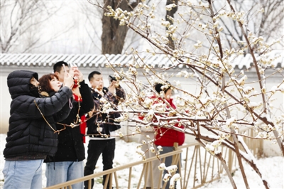 近日,本市腊梅盛开。图为众多市民来到水上公园,欣赏、拍摄春雪压腊梅的美景。 记者 姜宝成 摄