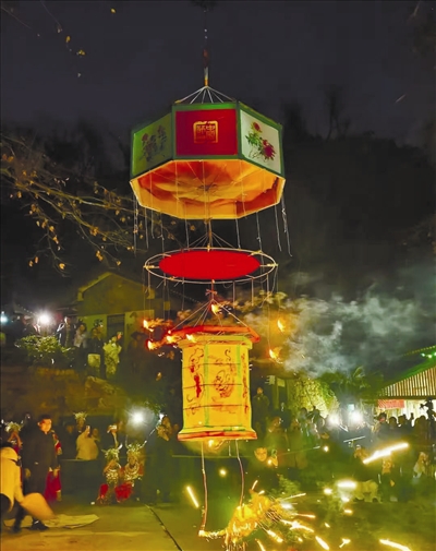 到最后,火花烧到最上面一层了,突然一下,好像到头来个小红灯,那么一亮,实际也是火药,这就宣告结束了。这是盒子灯。