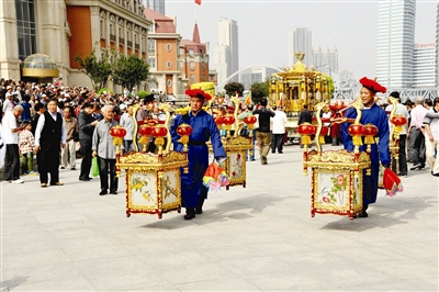 这八仙过海的时候,在东海里头,好像得罪了海里的神了,上来四个大帅,就是“鱼蚌虾鳖”,一个金鱼精,红色的大金鱼,挺漂亮;还有一个虾的模型套在一个人的身上,虾米头、鱼头的;还有一个背着一个王八形状的;还有一个河蚌,就是两个大蛤蜊当中一个小美女,能张能合,能把八仙的宝物给夹住。八仙过海跟鱼蚌虾鳖——这四个“大帅”互相打斗。所以,地秧歌看起来也挺有趣,挺有意思。