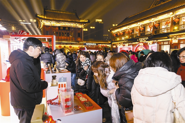 在古文化街启动活动现场,沉浸式的消费场景将现场表演、非遗展示、互动体验与消费推介深度融合,让广大市民游客深度体验春节喜庆和消费乐趣。现场首发了中英文双语《购在中国·京津冀消费指南》,为国内外消费者提供精准消费指引。集中展示了三地老字号、非遗精品、大健康产品、科技新品、新消费品牌等特色商品,首次推出五款三地商品集成礼盒。发布了“京津冀‘必购必带’特色伴手礼推荐名录”,推广展销三地优质好物,全方位彰显京津冀特色消费魅力。设置了京津冀有礼、金融助力消费、健康消费等展区,集中展示服务消费新场景和商品消费新模式。