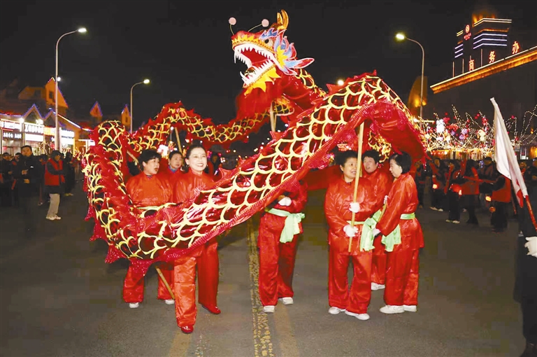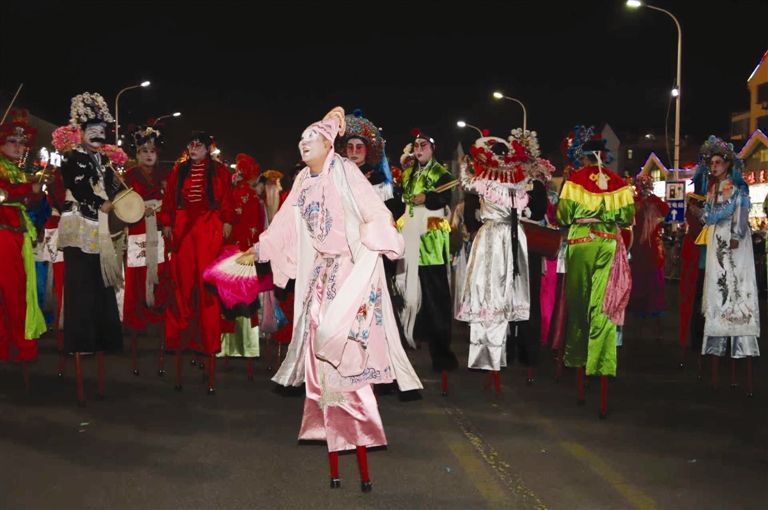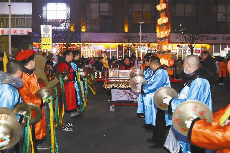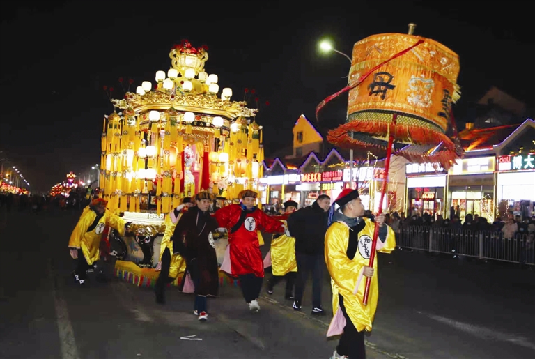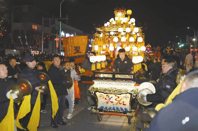庄严的宝辇缓缓前行,浑厚的法鼓铿锵作响,俏皮的高跷灵动翻飞,还有气势磅礴的舞龙、激情洋溢的小车会等,华灯映照下的表演者们不断变着花样,使出看家本领,将民间传统技艺展示得淋漓尽致。街道两旁的观众边看边鼓掌叫好,人们在民俗活动中迎祥纳福,寄托对生活的美好期望。