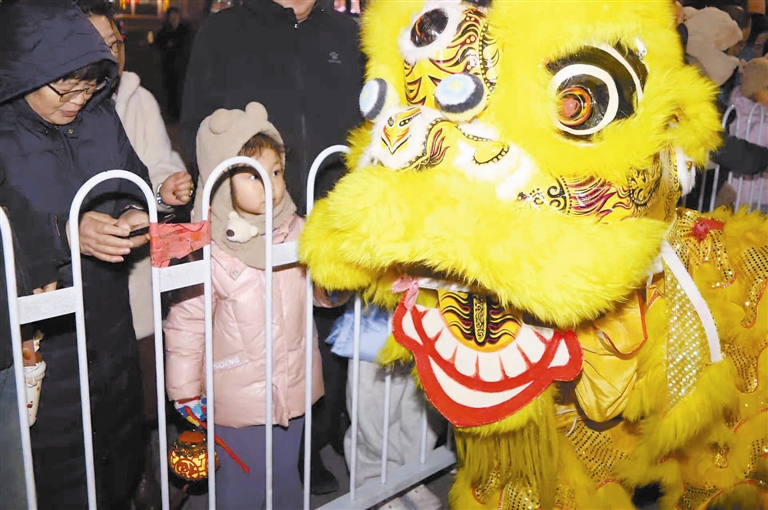 “咚咚锵……”欢快喧闹的锣鼓声中,大红色的醒狮一边翻腾跳跃,一边从围栏上方探出头,与观众中的小朋友互动。两岁的琪琪从爸爸怀里伸出手,想要摸摸狮头,笑出一排小奶牙。