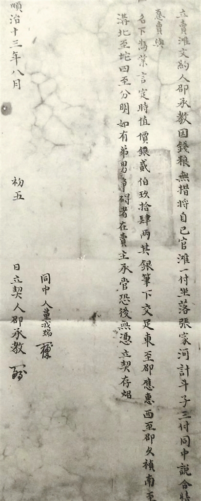 从顺治年间开始到民国末年的300多年历史中,官滩的叫法一直被延续下来。官滩分自置官滩、祖遗官滩和祖遗在册官滩三种。如顺治十三年(1656)八月初五日的滩契中写道:“立卖滩文约邵承教,因钱粮无措,将自己官滩一付(副),坐落张家河,计斗子三付(副),同中说合,情愿卖与崔名下为业。”这是迄今为止看到的最早的一张标明官滩的滩契。在滩契中,不仅写明了卖滩的原因,还详尽列出了卖滩者所拥有的各种生产资料、坐落位置和具体的成交时间。最后是同中人和卖滩人。从此,这份滩契成了后来买卖盐滩的模板。