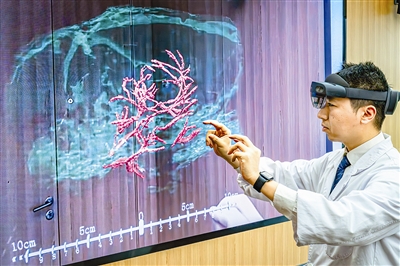 科研人员通过微米级脑机接口混合现实,精准呈现脑机接口与大鼠大脑主要血管和脑组织的空间位置关系。 新华社记者 肖艺九 摄
