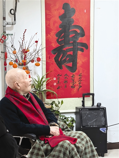 活动室里,背景板上写着“闵人先生百岁寿辰庆典”,闵人坐在轮椅上,身着藏青色外套,胸前是一条红围脖。他不怎么说话,偶尔目光扫过人群,嘴角微微上扬。老伴儿田本娜就坐在他右手边,银发整齐地向后梳拢,精神头很足。有人上前问候,她便笑着点头回应。