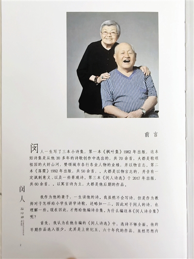 1950年,闵人组建安徽省黄梅剧团,排演了《天仙配》等名剧,参加了抗美援朝慰问。1955年调到天津做行政工作,他的诗都是在晚上写。“那时候家里地方小,我备课要到晚上十二点,我睡下了,他才起来,趴在桌子上写,很多诗都是那样写出来的。”田本娜顿了顿,“那些年,他从没抱怨过一句。但我心里头,总觉着亏欠他。更主要的是,闵人现在已99周岁,以过去的算法,今年是他百岁。我以这本《闵人诗全集》作为送给老伴儿的百岁纪念吧!”