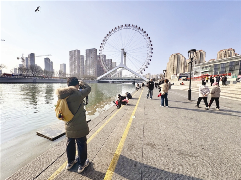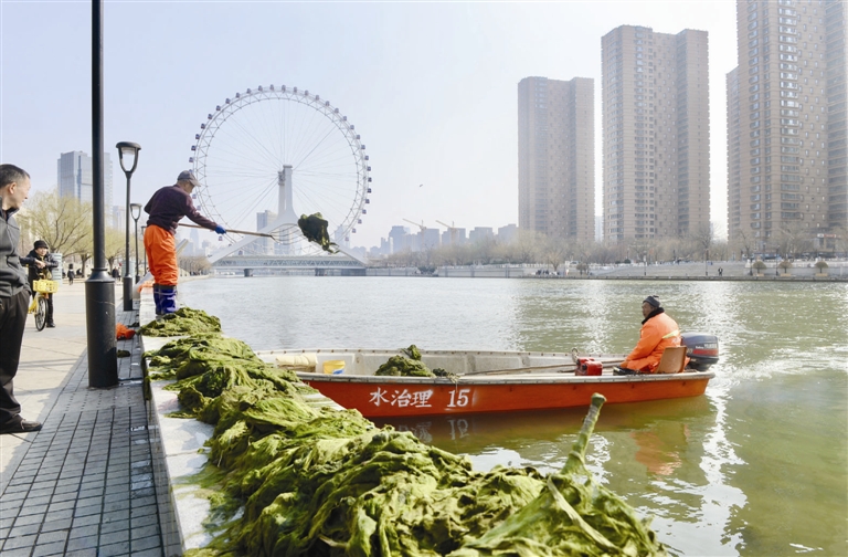 随着气温回升,春日暖阳洒满津城。这边,海河河道内水草进入生长旺盛期,为保障河道整洁畅通,天津河道清洁工人加大清理力度,采取“人工打捞+船只清运”的方式,对河面漂浮物及水草进行集中清理。那边,在“天津之眼”摩天轮下,不少市民漫步海河河畔,拍照打卡,尽享春日好时光。