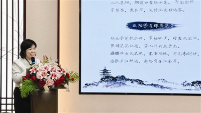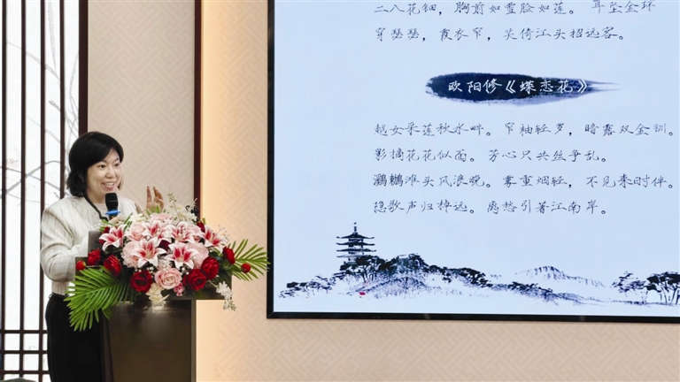 为阐述诗词对精神成长的阶梯作用,张教授对比赏析了欧阳炯《南乡子》、薛昭蕴《浣溪沙》、欧阳修《踏莎行》与张昊的《西湖闲咏》。她总结说,这四组形象层层递进,展现了由外而内、由情入理、由个体升华为家国担当的精神高度。她引用“诗者,持也,持人性情”指出,诗词并非装饰性才艺,而是以言语涵养心志、塑造人格的修身路径。