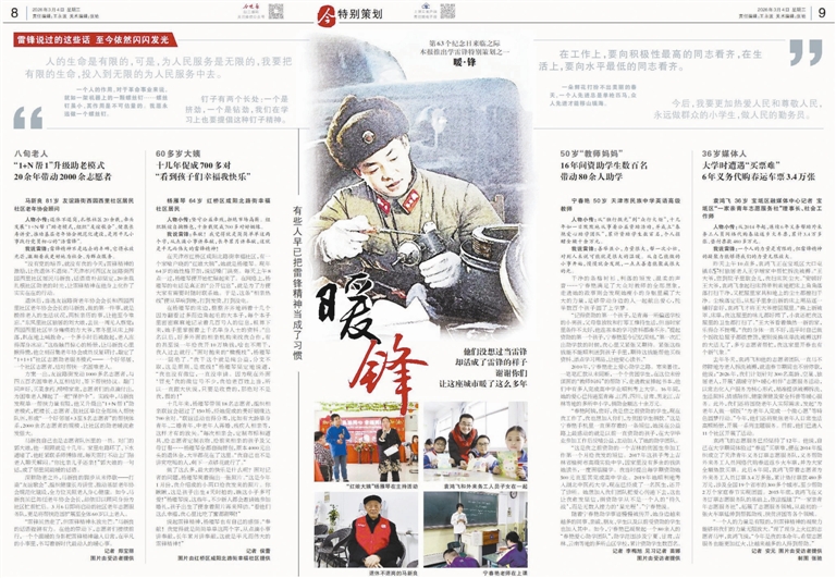 在第63个学雷锋纪念日到来之际,本报连续3天推出“暖锋、新锋、先锋”系列报道。回望这些平凡英雄的故事,我们看到的不仅是“一个人”的坚持,更是“一群人”的共鸣。
