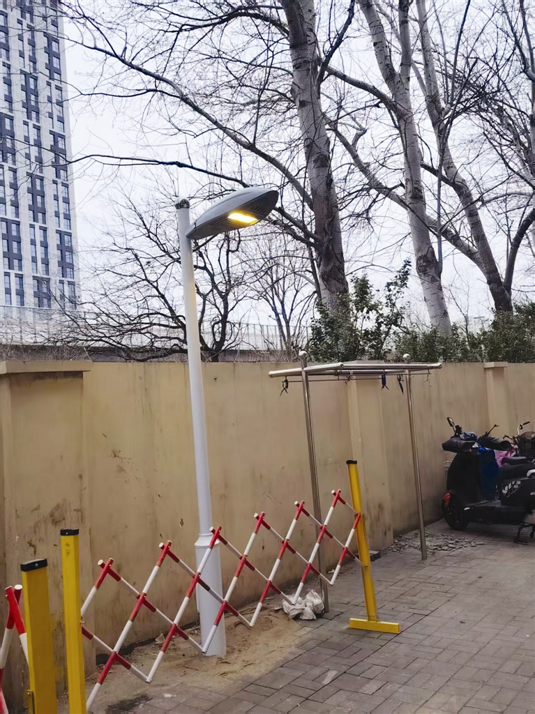 居民的诉求,反映到相关部门后得到了重视。贾伟说:“之前路灯管理处制定了安装规划,在开工前,我们和景观中心的工作人员一起又进行了现场调查。首先去居委会询问居民意见,然后进行实勘,有居民提出了灯具的照射方向等建议,我们根据居民的意见进行了修改,比如让光源照射地面,不会直对居民家窗户,安装的位置微调,正好在两户居民之间。这样的操作,就是为了让居民们既享受光明又不会被侵扰。最终确定,普天里花园小区的这片空地要安装7盏路灯,每盏灯的高度为3.2米,这样的话,既能照亮道路,还不影响居民生活。”