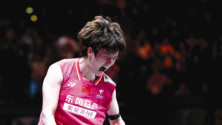 本报讯(记者 苏娅辉)北京时间昨天,2026全英羽毛球公开赛落幕,中国队时隔7年再次夺得女单和女双冠军。其中,王祉怡(上图)以21比15、21比19战胜韩国名将安洗莹,结束了对阵对手的10连败,并终结了对手跨赛季36连胜,首夺全英赛女单冠军。刘圣书/谭宁以21比18、21比12击败韩国组合白荷娜/李绍希,首次登顶该赛事。