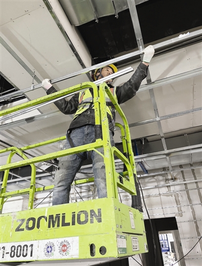 在三层的建设现场,几名工人使用小型托举车,对屋顶区域安装金属固定槽。工人可通过控制器自主操控这些小型机械的升降与移动,避免了工人爬上爬下的麻烦。按照规划,三层将集中建设日间手术室,一间手术室样板间已经建成。“这间手术室的空间比较大,里面还计划加入很多智能化设施。”施工人员表示。在他的指引下,可以看到手术室内电源按照使用功能分门别类设置,墙壁上的液晶情报控制屏幕,实时显示空间的温湿度等数据。