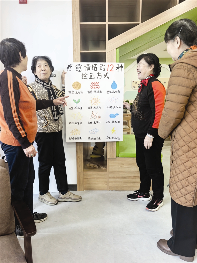 楼下的空间就丰富多了。进门是休闲区,摆着沙发、矮桌,有居民在此阅读报纸。再往里是茶空间,吧台后有人在冲咖啡。墙上挂着一排画,颜色鲜艳,风格简单随意。工作人员说,这是心理疏导类绘画活动,不同情绪可通过不同图形表达。一位女士正在往画纸上涂太阳,她说心烦的时候就来这儿画画,情绪逐渐得到缓解。