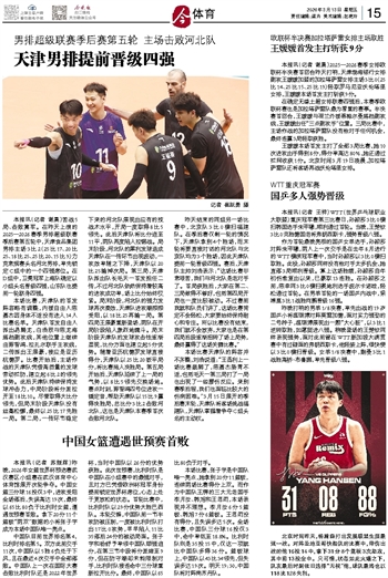 本报讯(记者 谢晨)苦战5局、击败冀军。在昨天上演的2025—2026赛季男排超级联赛季后赛第五轮中,天津食品集团男排主场3比2(25比17、20比25、18比25、25比20、15比9)力克常规赛头名河北男排,率先锁定C组中的一个四强席位。在D组中,卫冕冠军上海队确定以小组头名晋级四强,山东队也提前一轮跻身四强。