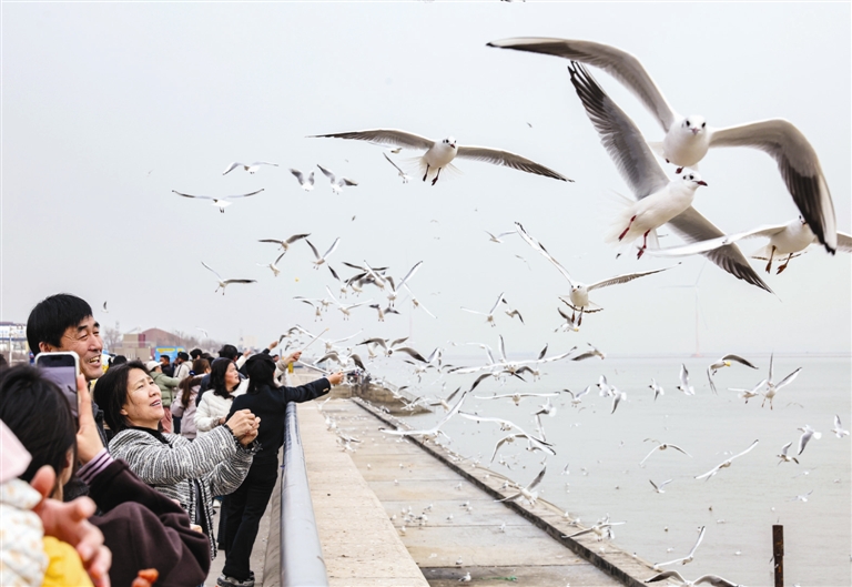 连日来,随着天气渐暖,东疆观鸥季进入尾声,越冬海鸥即将北归。现场除常见的红嘴鸥外,还可以见到珍稀遗鸥的身影。不少市民抓住最后的观赏时机,前往海边与鸥群合影留念,现场人气不减。