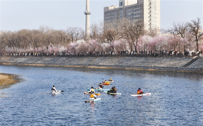 昨日,津城晴空万里,红桥区桃花堤运河桃花节迎来了一大波打卡人,前来踏青的人摩肩接踵,赏春日河畔最美景致。人们纷纷扛来皮划艇泛舟河上,在此也提醒各位“弄潮儿”,做好防护,注意安全! 记者 胡凌云 摄