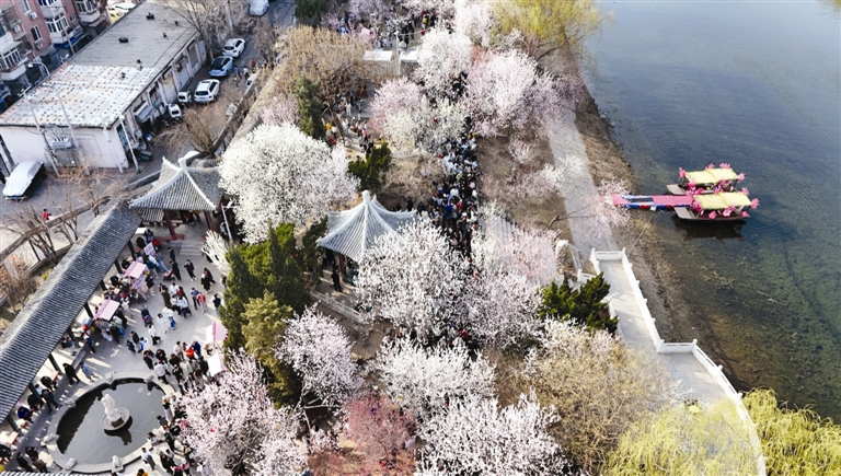 下午1时30分,北运河上的花船里传出琵琶和中阮的合奏,引得桃花堤上的游客驻足。原来是桃花节快闪节目开场了,两条花船各载着一名舞者和一名乐师,一边青绿一边橙红,一曲《儒风拂影》在运河的粼粼波光之中萦绕。游客一边欣赏一边拍摄,更有不少在园中其他地方拍照的人们,赶过来给自己和花船拍合影,记录这别有韵味的春日。