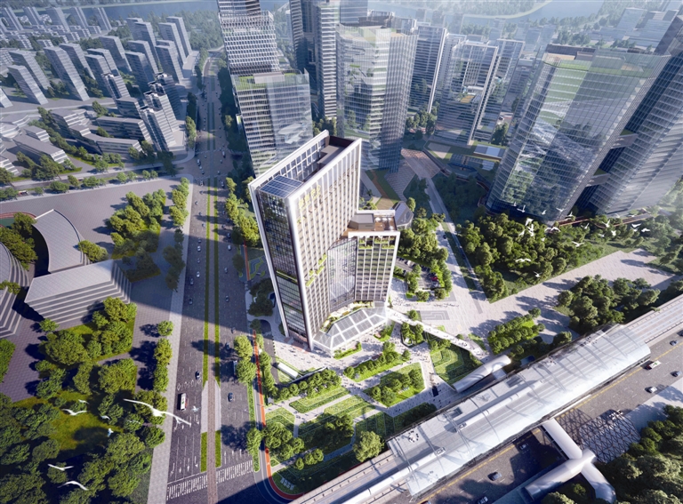 其中,绿创中心总建筑面积约6.5万平方米,地下2层,地上23层,建筑高度99.5米,集商业、办公与酒店等多元业态于一体,重点引进创新型总部、专业型智库等高端业态。