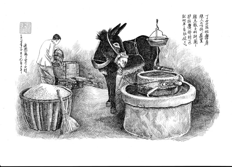 丁字沽一带的磨房有两种形式,一种主要为自家店铺加工粮食,另一种是专门为用户加工粮食,后者规模较大,不仅有拉磨的,还有推磨的、手磨的和小型仓储。“曹家丝糕”在丁字沽非常有名,他家不但有磨房,而且已经使用驴来拉磨,这在当时就算“半自动化”了。“曹家丝糕”的主要原料是大米,而且必须用河南的籼米、山西的碱面。二斤半的米、一斤半的枣儿,蒸熟了,七斤半一个。“曹家丝糕”之所以受欢迎,就因为面磨得好,中间要过好几遍箩。蒸熟的丝糕除了在铺子卖一部分,其余的就挑着挑儿到宜兴埠或辛庄、堤头、西沽售卖。此图根据丁字沽居民杨世均、曹振刚的口述绘制而成。