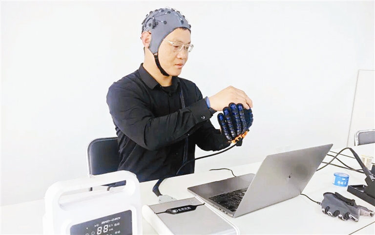 “目前,脑控康复手已经进入测试阶段。”胡建波戴好电极帽及康复手,与自主研发的脑电采集设备同时接入电脑测试系统,大脑发出信号,控制康复手完成抬高、下落、攥拳等康复训练动作,准确率达到90%以上。患者经过反复训练,受损的神经纤维有望重新建立连接。今年上半年,这一产品将在首都医科大学宣武医院投入临床试验。