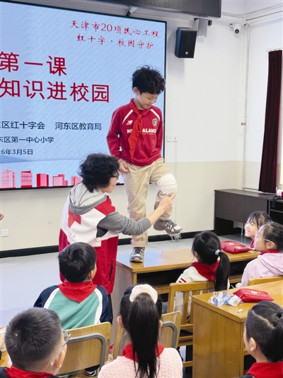 近日,河东区第一中心小学的教室里,80余名四年级学生的回答声清脆响亮。作为2026年天津市20项民心工程“红十字·校园守护”项目启动现场,河东区红十字会培训讲师吴琼带着实用急救技能走进校园,记者全程沉浸式参与,和孩子们共同上完一堂实用又生动的安全课。