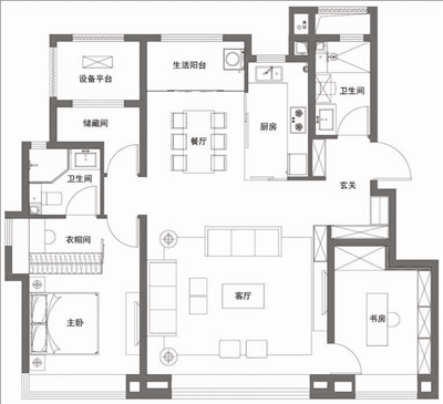 约117平方米的两居室,围合的设计赋予更多想象的空间,厨房与餐厅的围合营造出锅碗瓢盆的音符,而方正的客厅则是两人共度美好时光的领地,充满创意的书房在不远的未来便会成为小宝宝的“游乐园”。