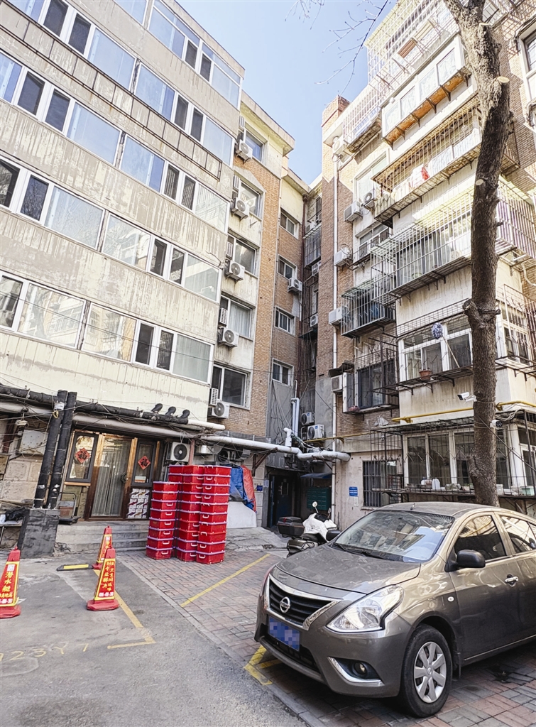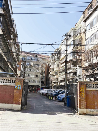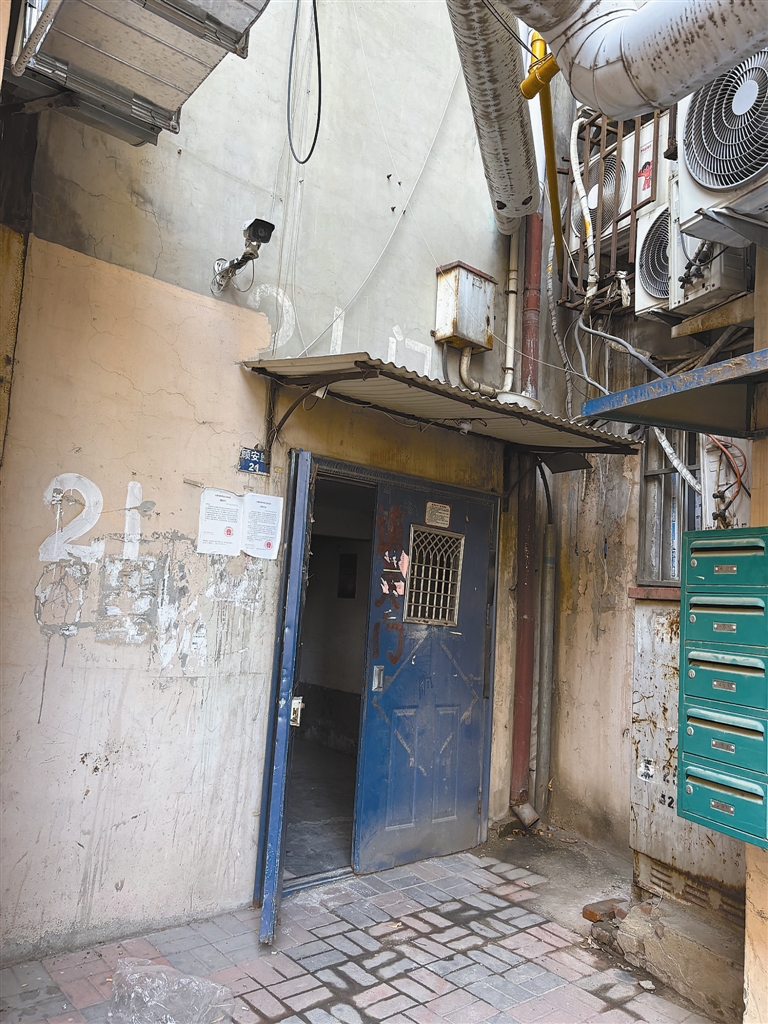 记者来到刘阿姨居住的顾安里小区,该小区坐落于海河北岸,紧邻进步桥,出入口分别位于平安街与寿安街,隶属于河北区光复道街庆安街社区居委会。刘阿姨居住的4号楼21门入口位于寿安街一侧,记者看到,21门与22门两个楼门均为六层居民楼,楼体整体呈U形,21门与22门入口分别位于U形底部的两个拐角处,入口空间十分狭小,且楼门一侧楼体与相邻楼体呈90度角。
