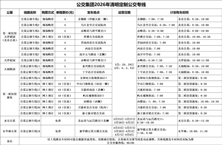 通往第一殡仪馆、第二殡仪馆、天津寝园、天福陵园的定制公交线路有车时间为3月28日、29日和4月4日、5日、6日,起始站发车时间多为7点左右,返程时间主要集中在9点30分至10点之间;通往永安公墓的定制公交有车时间为3月23日至27日、3月30日至4月3日;通往东华林公墓的定制公交有车时间为3月23日至27日、3月30日至4月3日以及4月7日至8日。