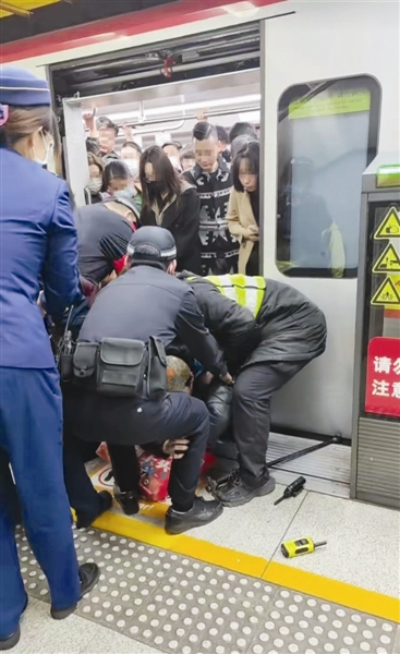 近日,地铁1号线下瓦房站内发生了惊险的一幕:一班地铁到站后,乘客匆匆下车。突然,地铁门附近传出一名老人的高声呼救:“我脚卡到夹缝里边去了,出不来!”循着乘客的呼喊声,驻站民警曲晨、辅警刘春庆及车站工作人员火速抵达现场。“向后退,向后退!”民警辅警见状一边疏散围观人群,一边迅速开展救援工作。