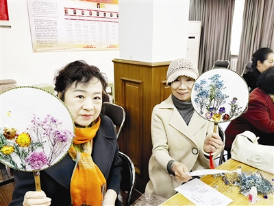 3月24日上午,河北区华屏里社区活动室里,近三十位老奶奶围坐一堂,或手持精致团扇,或细心粘贴干花——这是一场专为她们举办的“巧手制扇”活动。